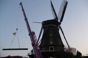 Korenmolen “De Valk,” al sinds 1753 gezichtsbepalend voor Montfoort, heeft 15 februari weer een stap verder gezet in de restauratie. Door een grote kraan werd de ruim 700 kilo zware koningsspil omhoog gehesen. Het hoogste punt van de molen is natuurlijk al 255 jaar geleden bereikt, maar de nieuwe spil kan wel degelijk gezien worden als een “mijlpaal.”