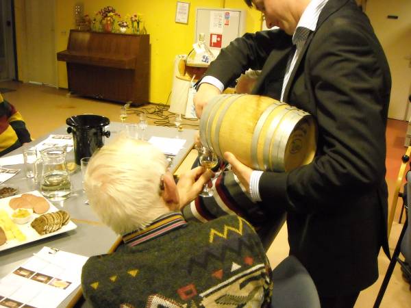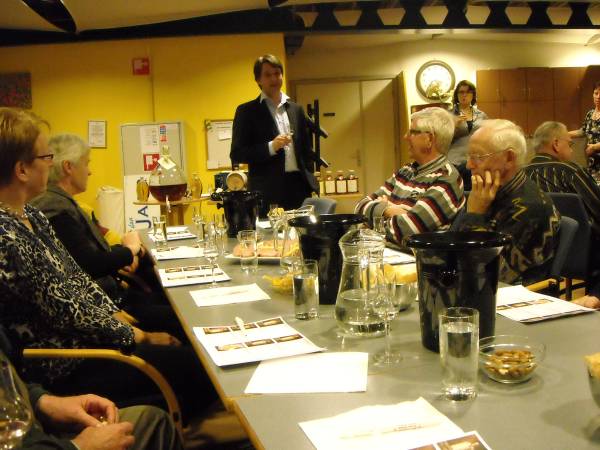 Zijn verhalen over de geheime recepten en de ambachtelijke distilleerderij, het afvullen en de met de hand ingevulde etiketten werden met belangstelling gevolgd. Zijn trots op het familiebedrijf en zijn gedegen kennis over de producten bracht hij, doorspekt met humor. “Wie bewaard er zijn genever in de koelkast? Wij serveren u de genever zoals het hoort, op kamertemperatuur. Alleen als u een slechte smaak wilt markeren dan drinkt u hem ijskoud.”