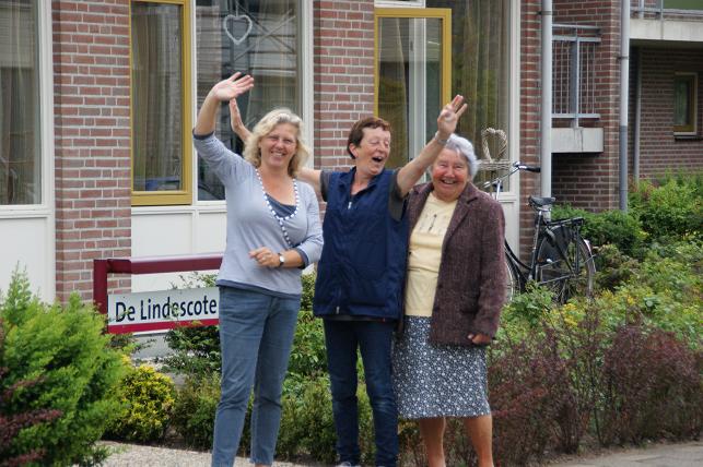 Personeel, vrijwilligers en buren van De Lindescote zwaaiden de bus uit. |