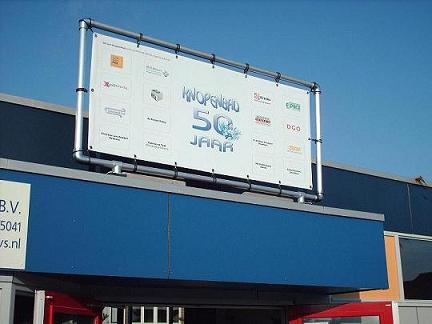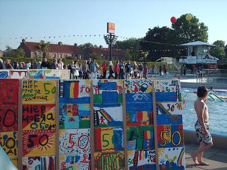 Het feestelijke jubileumbord boven de ingang van het zwembad