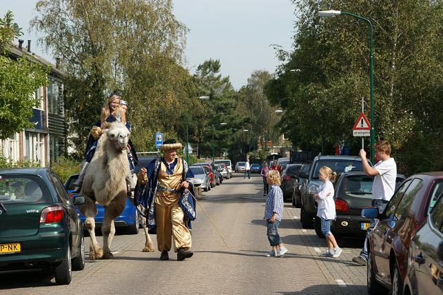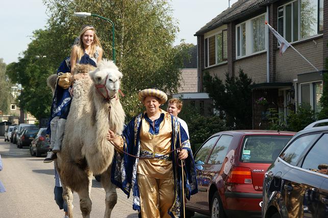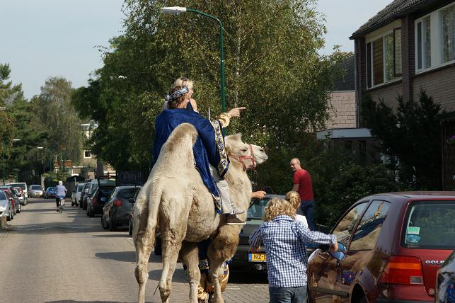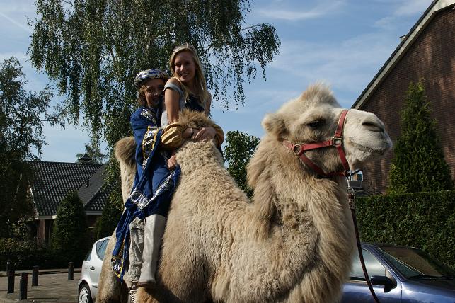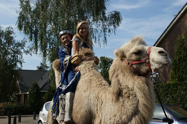 En zo gezegd, zo gedaan. Onder het motto ‘Is één kameel ook genoeg?’ kwam Peter zaterdagmiddag, geheel in stijl gekleed, op een kameel de straat ingereden.