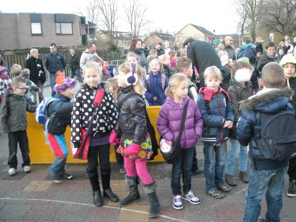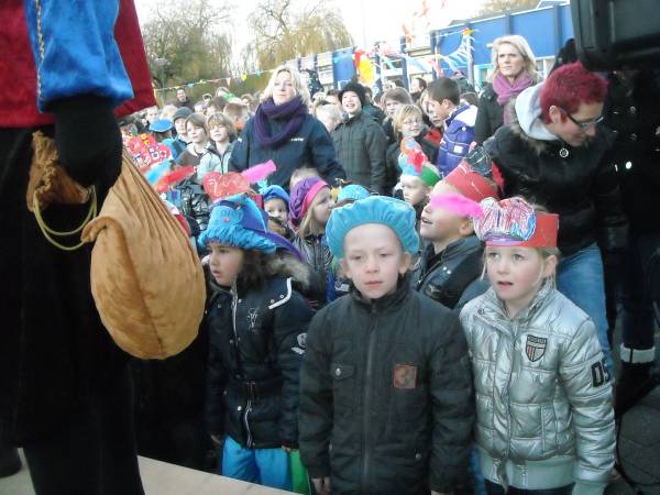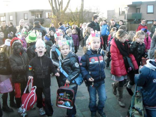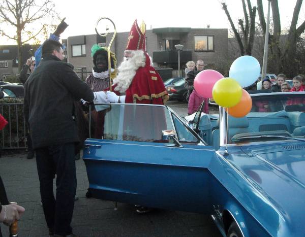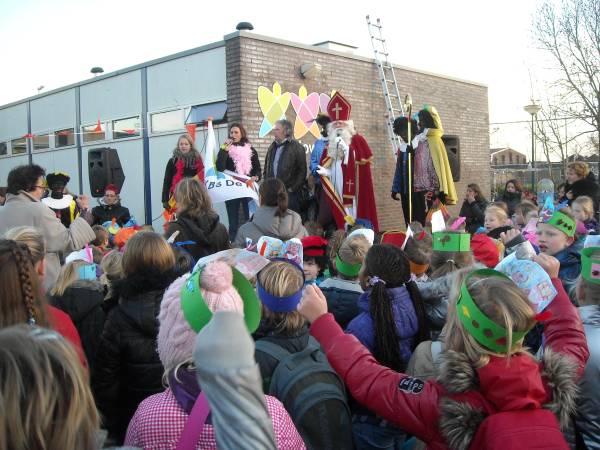 De groepen kinderen waren slim over de speelplaats verdeeld, zodat ieder goed kon zien wat er allemaal gebeurde. Een open oldtimer  met chauffeur bracht Sinterklaas en zijn Pieten op het schoolplein, waar ze warm werden onthaald.