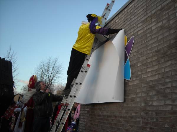 Zwarte Piet hielp Harrie met het onthullen van het nieuwe logo: drie kleurige vlinders.   “Dieren die sprankelend door het leven gaan,” zei Harrie. Ze verbeelden ook de drie-eenheid, en de drie wijken waar de kinderen wonen die hier op school gaan:  Hofland, Willeskop en Blokland.”