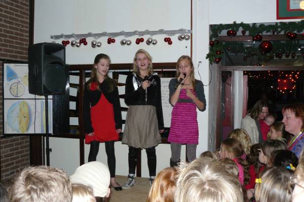 Er was een open podium, waar diverse groepjes kinderen optraden. Je kon op de foto. De Kerstman ontbrak uiteraard ook niet. In de aula kon de inwendige mens versterkt worden. De kinderen verkochten hun eigen gemaakte kerstwerkjes en natuurlijk werd ook de CD, waarop de door kinderen en personeel ingezongen kerstliedjes stonden, enthousiast verkocht.