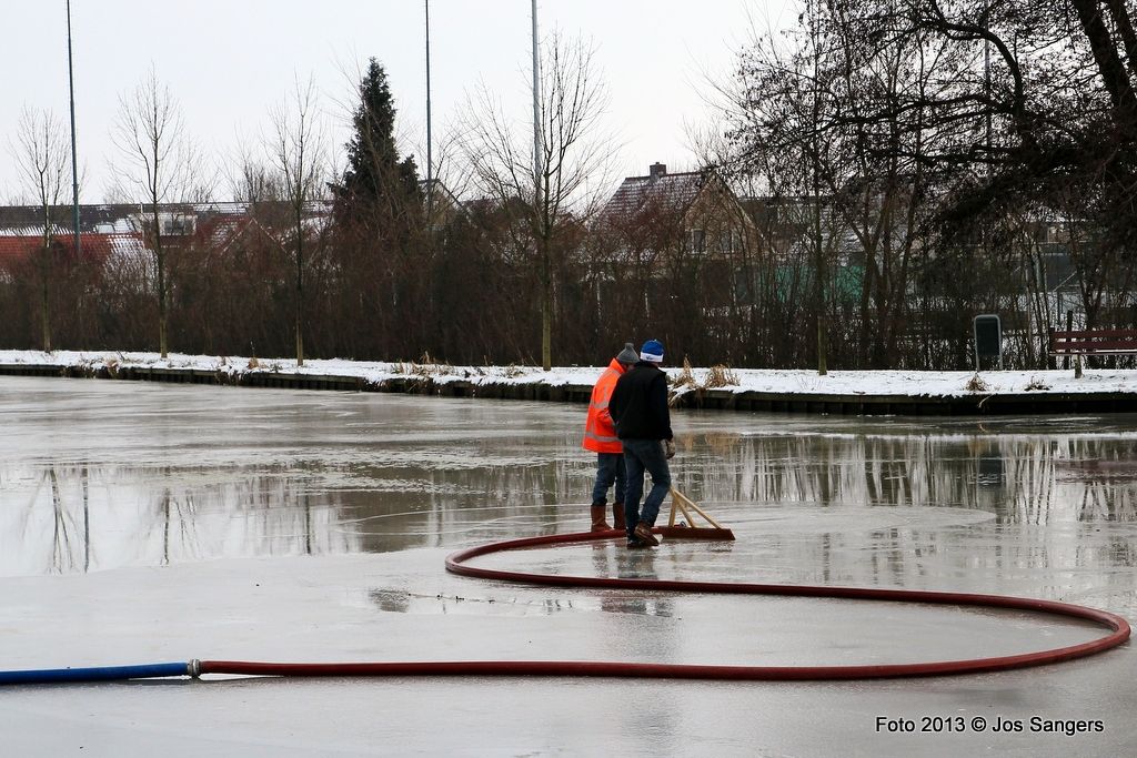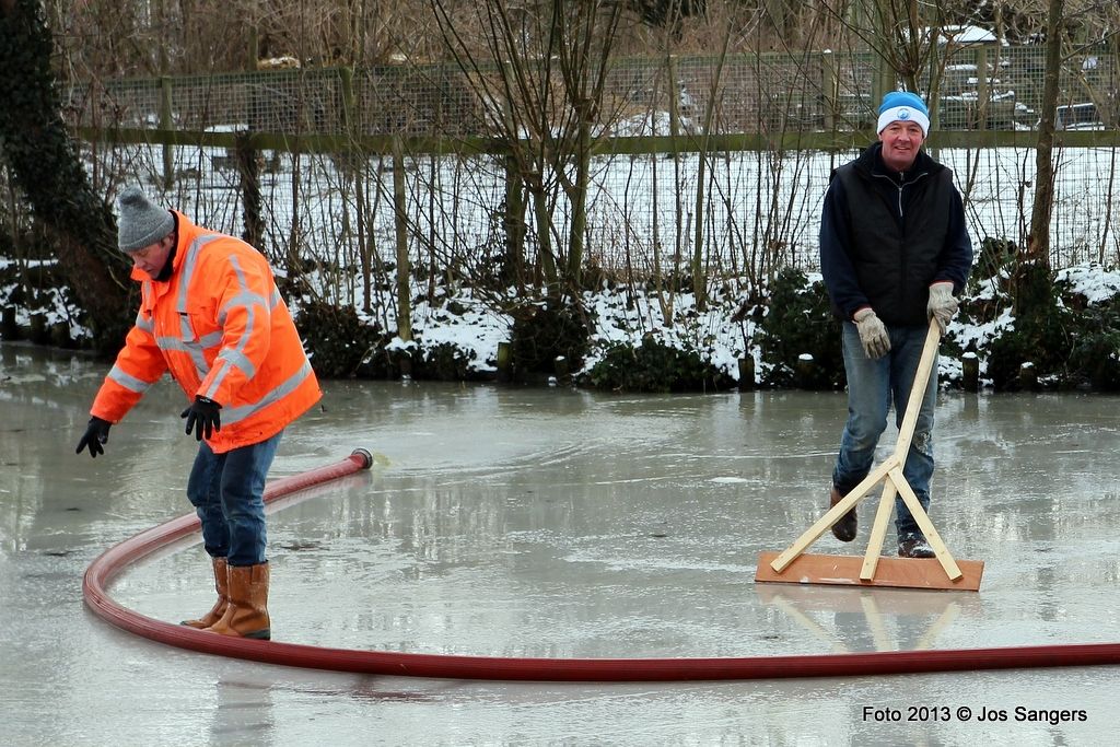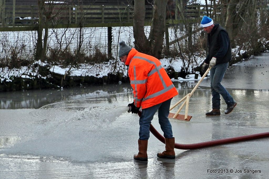 De grote gracht werd, met gevaar op een nat pak, door de ijsclub voorzien van een vers laagje water, in de hoop dat dit zal aanvriezen tot een meer betrouwbare ijsvloer.