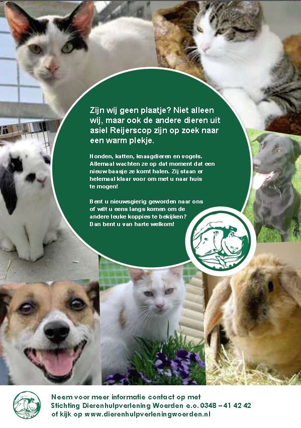 Alle dieren en siervogels die momenteel in het asiel in Harmelen verblijven, mogen nu op de voorgrond treden.