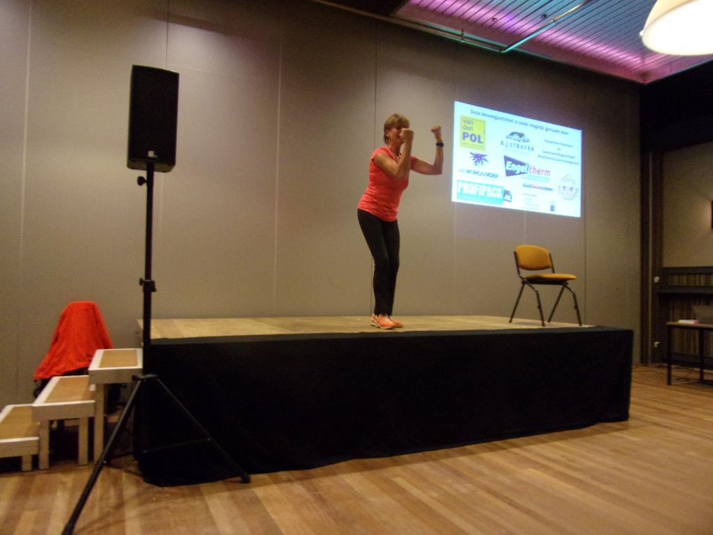 Olga Commandeur, vooral bekend van het tv-programma Nederland in beweging, zette een wervelende presentatie neer. Met duidelijke uitleg waarom bewegen goed is en contact en wederhoor vanuit de zaal wist ze iedereen op de been te krijgen.