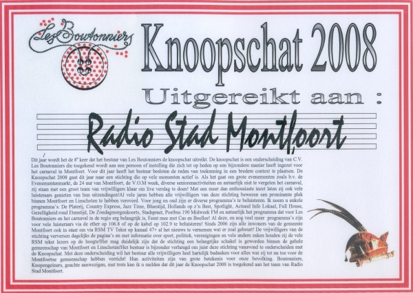 Vrijdagavond kreeg Radio Stad Montfoort tot hun verrassing deze zilveren speld met oorkonde uitgereikt door Prins André l’Alpinist tijdens het openingsbal in de leutbunker.