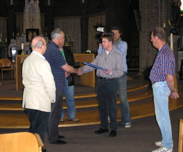 Foto van de formele overdracht met vlnr Stef Tuinstra (orgeladviseur), Sjaak Spruijt (vice voorzitter parochiebestuur Montfoort), Roelof Oost (lid restauratiecommissie Urk), Jouke Posthumus (lid restauratiecommissie Urk) en Wim Beukers (lid parochiebestuur Montfoort). |