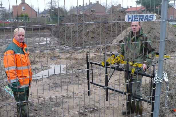 Steven Jonkers en Albert Rijpers van de ECG baggeren met hoge laarzen door de plassen. Een zwaar rek voor zich uithoudend, kort boven de grond. “Er is al heel wat pers langsgeweest vanmorgen, en niemand had een beker koffie voor ons bij zich,” mopperen de twee mannen. Maar al gauw breekt de lach weer door. “Ach, wellicht vinden we hier nog wat interessants, oude munten of zo..”