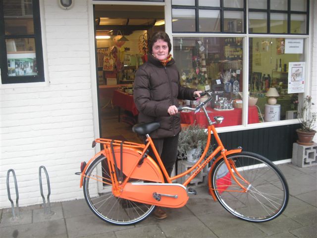 De winnares van de hoofdprijs, een mooie oranje opoefiets. (Foto Gusta de Jong).