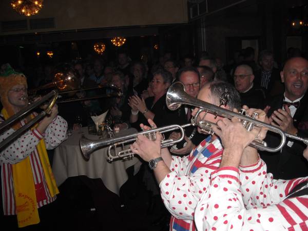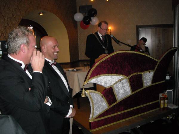 Leendert Scheel en burgemeester Jansen memoreerden het verleden van de vereniging. Het enthousiasme van alle Knopengeiners. Of het nu ging om de carnavalsmis (die mag je niet missen) of de optocht, die, toen er via de website kon worden ingeschreven, binnen vier uur was volgeboekt. Burgemeester Jansen overhandigde namens de gemeente een cheque van €111,11 Maar voegde er aan toe, dit kan niet volgens de Montfoortse regels. Dus kwam er een extra cheque van €38, 89 bij, om een wettelijk getal te krijgen..
