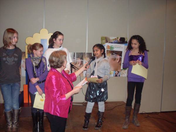 Nirmala ontvangt haar prijzen tijdens de uitreiking door wethouder mevr. P. Goedvolk
