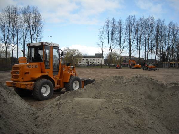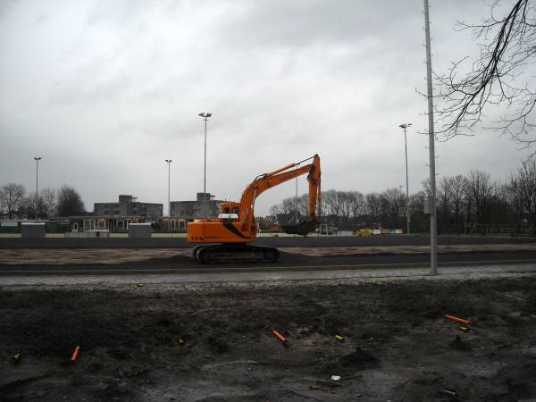 Tot verbazing van voorbijgangers is een shovel lava en zand aan het afgraven bij het nieuwe kunstgrasveld aan de Parklaan in Montfoort.
