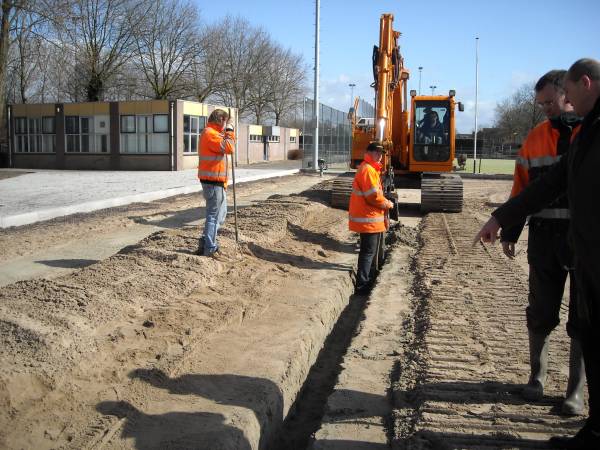 Helaas is bij de monsterneming van het drainagezand iets fout gegaan, waardoor de drainagesleuven moeten worden uitgegraven en opnieuw gevuld met de juiste soort. Deze extra werkzaamheden gaan een dag of vier kosten.”