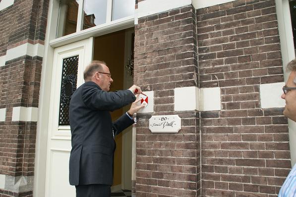 Burgemeester Jansen plaatst het officiële schildje samen met de heer Valk op het pand.