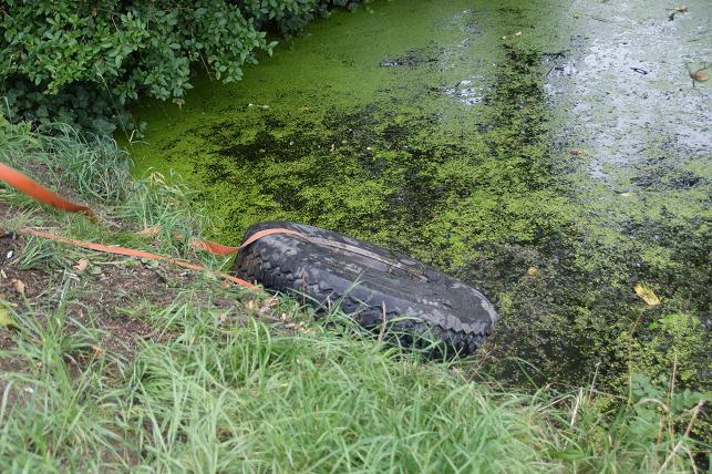 Het wiel wordt uit de naastgelegen sloot getrokken.