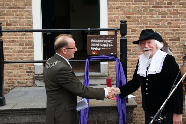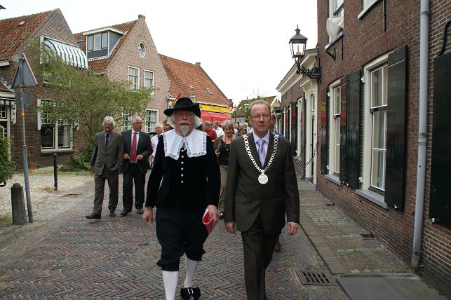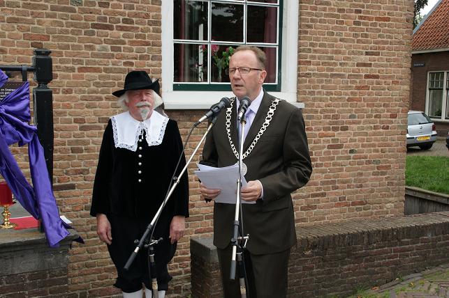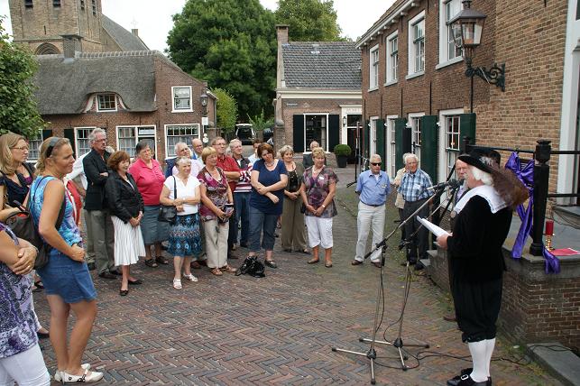 Vervolgens nodigde de ambachtsheer (gespeeld door Henk Kalfsterman) iedereen uit voor een hapje en drankje in Het Wapen van Linschoten en Snelrewaard. Daar werd door dhr. Ad v.d. Wind van de VVV de eerste Monumentenroutegids overhandigd aan burgemeester Jansen.