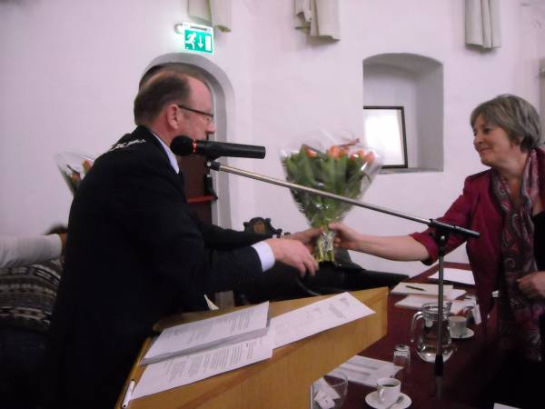 Er was een feestelijke stemming die opgefleurd werd met een bos tulpen voor alle nieuwe raadsleden. De burgemeester zei in zijn toespraakje dat de raad een enerverende tijd tegemoet gaat vanwege de beoogde bezuinigingen. Hij wenste hen moed en wijsheid toe.