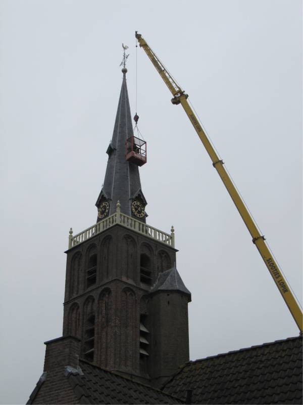 Aan de toren van de Montfoortse Grote- of Sint Janskerk worden momenteel met een hoogwerker onderhoudswerkzaamheden uitgevoerd. De toren had tot 1877 twee inspringende geledingen, maar in 1877 merkte men dat de toren begon te verzakken.
