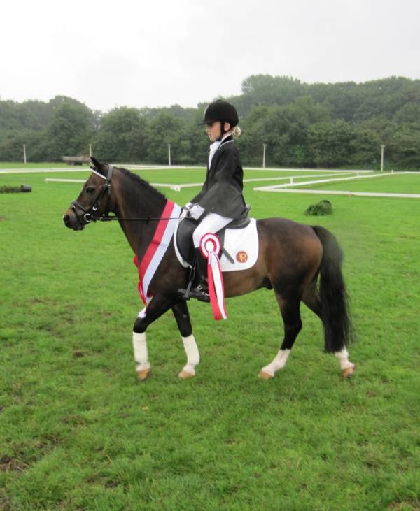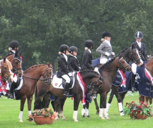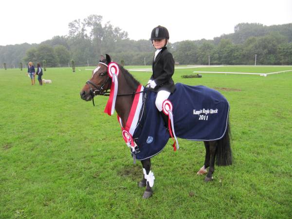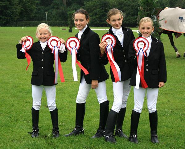 Jessy Tewis met Bacardi getooid met de kampioenslinten | Ook in de dressuur klasse B cat. AB wist ze een mooie 4e plaats te behalen door in twee proeven 182 en 181 punten te rijden. Ze werd op haar hielen gevolgd door haar 9-jarige zus Jessy die met Bacardi de vijfde prijs op dit kampioenschap pakte. Een prima eerste dag dus. Maar ook op de 2e dag moesten de zusjes met hun pony’s in de ring verschijnen. Samen met hun 10-jarige vriendinnen van de Voornruiters Celine Noorbergen en Isabelle Oskam, respectievelijk met hun pony Sunny en Sophie, streden ze ook om de kampioenstitel viertal klasse L cat. AB. Voor de meeste verenigingen is het moeilijk om met deze maat pony’s een viertal in de ring te brengen dat qua maat en vaardigheden van de ruiters/amazones voldoet aan de eisen. De concurrentie in deze rubriek was dus ook niet groot, maar dat neemt de vreugde van het behalen van het kampioenschap niet weg. Slechts 0.6 % kwamen ze tekort om aan de limiet te voldoen voor het startbewijs aan de Nationale Kampioenschappen, maar hun commandante Jacqueline Noorbergen was dik tevreden. Dressuur rijden blijft een jurysport en dus bestaat altijd de mogelijkheid dat er grote verschillen zijn tussen twee juryleden, in dit geval maar liefst 11 punten. Maar ook daar moet je mee leren omgaan. Beter jong geleerd .......