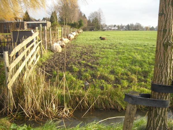 De schaapjes liggen lekker, uit de wind,  op het droge.