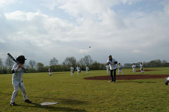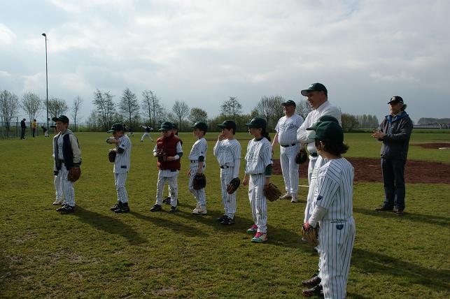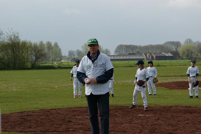 Burgemeester Jansen opende het honkbalseizoen officieel door de eerste bal van het seizoen te werpen. En dat is niet zomaar een balletje opgooien...