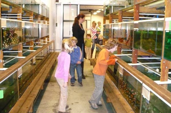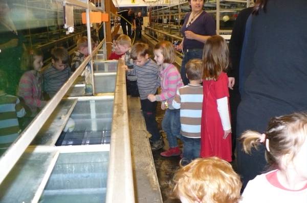 Vrijdag 14 maart gingen twee kleuterklassen met 40 kinderen van de school op bezoek bij Ruinemans. Daar kregen ze eerst een waarschuwing: “Niet met de vingers in het water, want dan kunnen de vissen ziek worden.” De kinderen vroegen de begeleiders honderduit tijdens hun tocht tussen de bakken en kregen uitgebreid antwoord: “Nee, deze vissen worden niet opgegeten, ze zijn vooral voor de sier, nee, we hebben geen schildpadden, wél salamanders.”