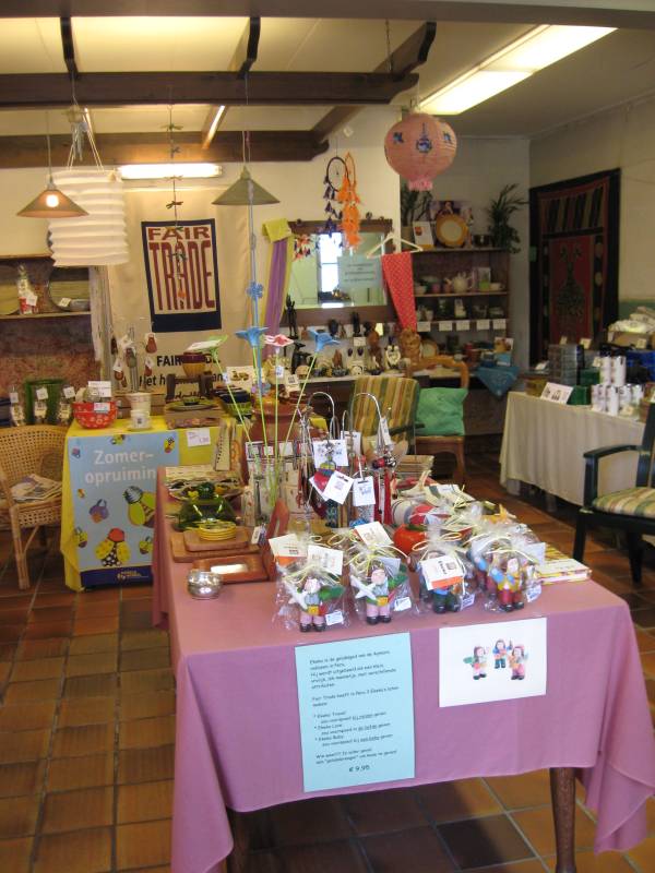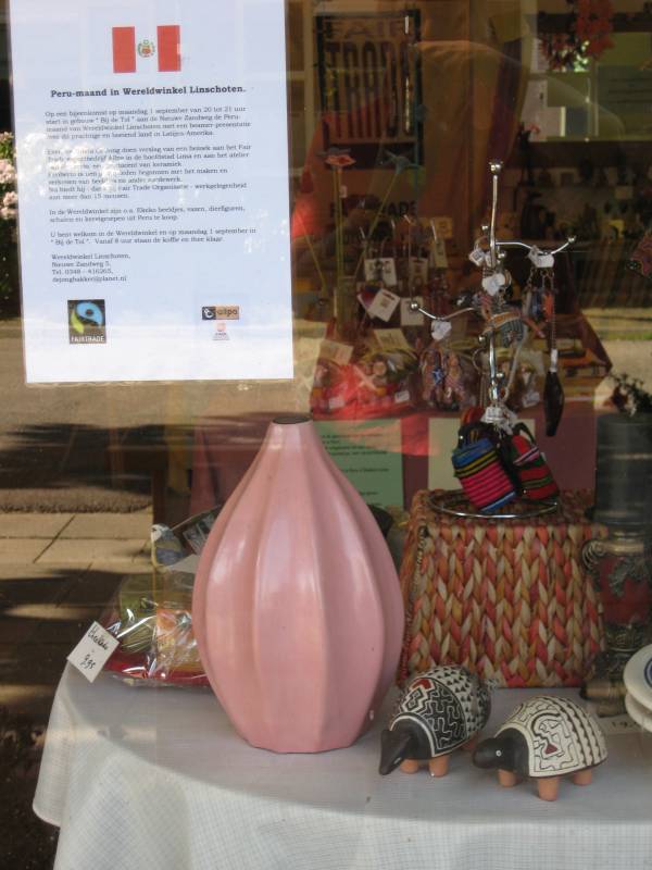 In de Wereldwinkel zijn o.a. ekeko beeldjes, vazen, dierfiguren, schalen en kerstgroepen uit Peru te koop.