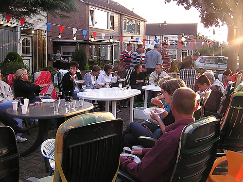 Het was toevallig wel de nationale buren-dag. Dus ze waren niet de enige in Montfoort die straatfeest hadden. Er kwam iemand bij die ze niet kenden, hij moest ergens anders zijn, dronk een biertje mee en ging op pad naar zn eigen straat feest...