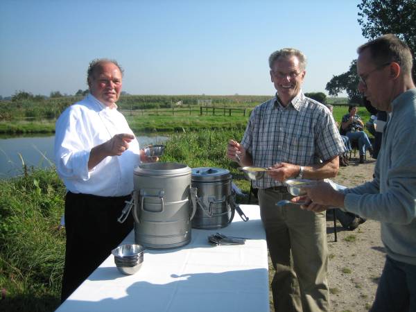 Eenmaal aangekomen op de Damweg werden ze getrakteerd op een kop snert,  aangeboden door de Stadskelder. Ondanks het prachtige herfstweer, smaakte de snert voortreffelijk. Rond de klok van twee arriveerden ze weer bij de Grote Gracht.