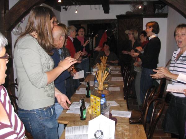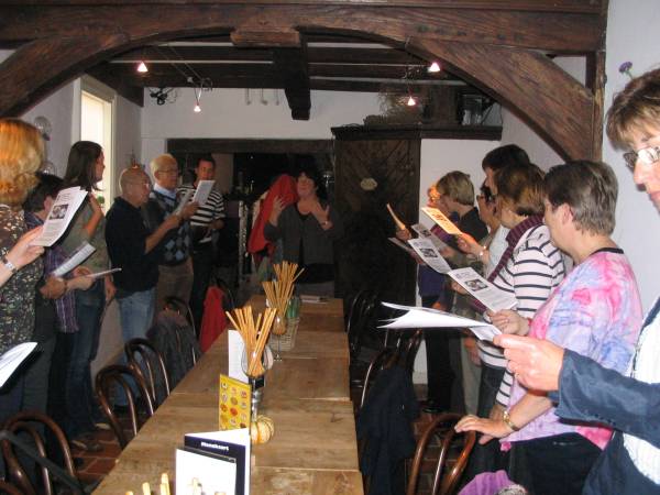 Annelies Bonouvrier van Tearoom/Vlaaierie Jill House aan de Markt te Oudewater trad 18 oktober op als gastvrouw voor de 2e Zingende Zaterdag van De ZangZaak. Deze themamiddag, waaraan liefhebbers van zingen (ervaren en onervaren) onder leiding van Monique v.d. Hoogen aan de slag gaan met een bepaald repertoire, stond in het teken van zingen over en snoepen in de herfst. Een prima combinatie !