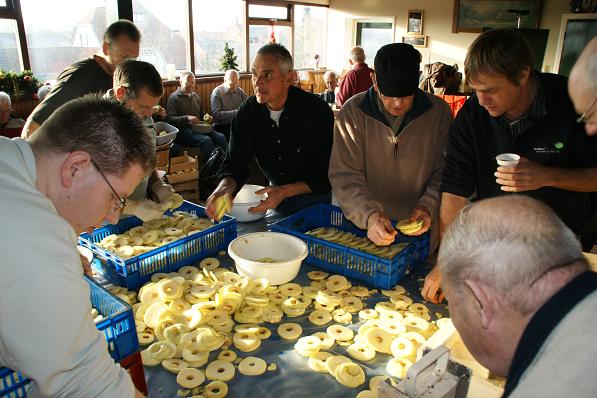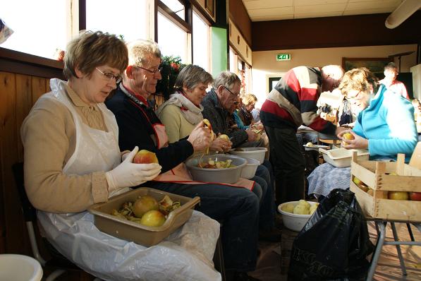 Er zijn ongeveer 40 vrijwilligers actief om van deze appels zo'n 10.000 tot 12.000 mooie appelflappen te maken.
