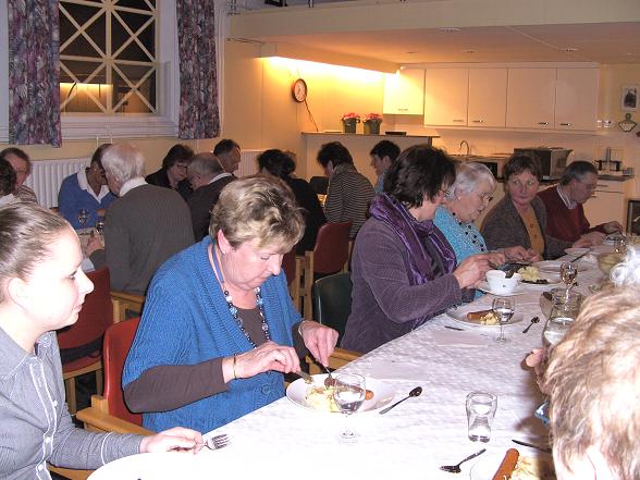 Met z'n allen aan lange tafels werd er genoten van de ouderwetse hollandse pot.