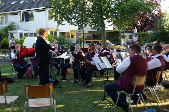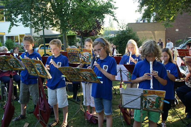 Woensdagavond 1 juli gaf muziekvereniging Ons Genoegen samen met hun blokfluitgroep De Fluitmajoren een buitenconcert in de speeltuin aan de Strick van Linschotenstraat in Linschoten.