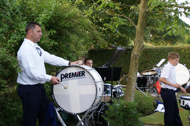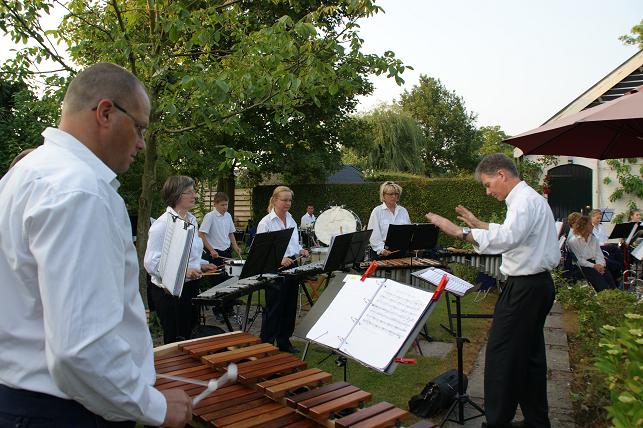 Onder het genot van een drankje genoot het toegestroomde publiek van de prachtige muziek gespeeld door de drum en malletband en het orkest van Linfano.