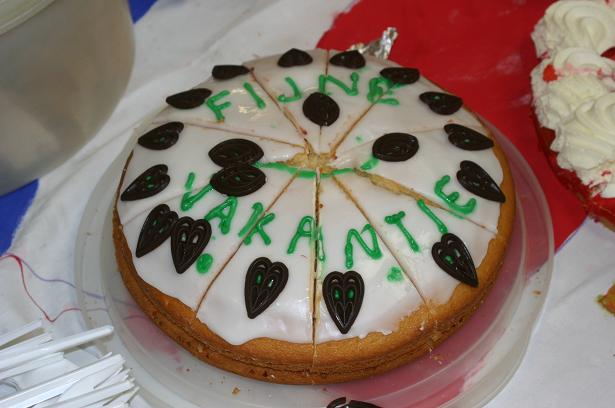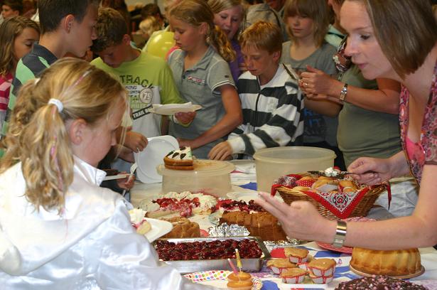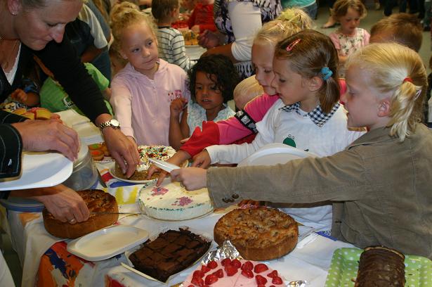 Na de pauze was er door moeders van leerlingen een prachtig taartenbuffet gemaakt. Tientallen taarten, cakes, brownies etc. waren gebakken en alle kinderen mochten net zoveel taart eten als ze op konden. Een “heerlijke” laatste schooldag dus voor de kinderen van de Graaf Jan.