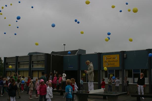 In de pauze werden door alle kinderen een blauwe of gele ballon, de kleuren van de school, opgelaten en ondanks het slechte weer had iedereen er plezier in om zijn eigen ballon zo lang mogelijk na te kijken.