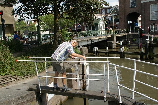 Afwisselend staan er vrijwilligers klaar die na een oproep de sluis komen bedienen.