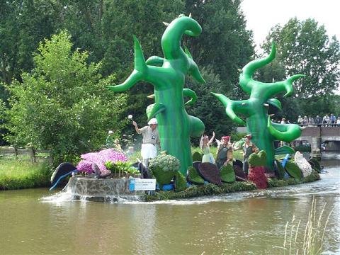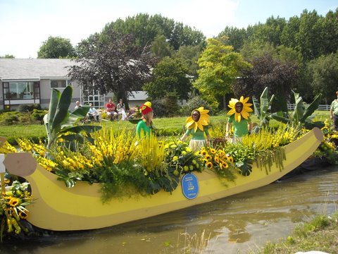 Na de lunch in het Westlandmuseum bracht de bus ons naar de oever van de Zijde, waar men genoot van het prachtige "Varend Corso". Ruim vijftig met bloemen, fruit en groente opgetooide boten voeren onder een stralend zonnetje voorbij.