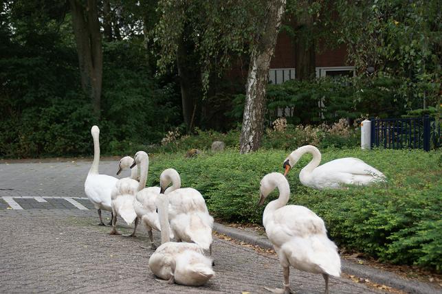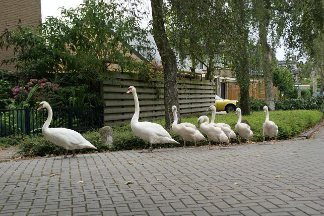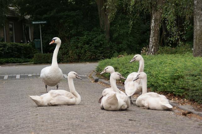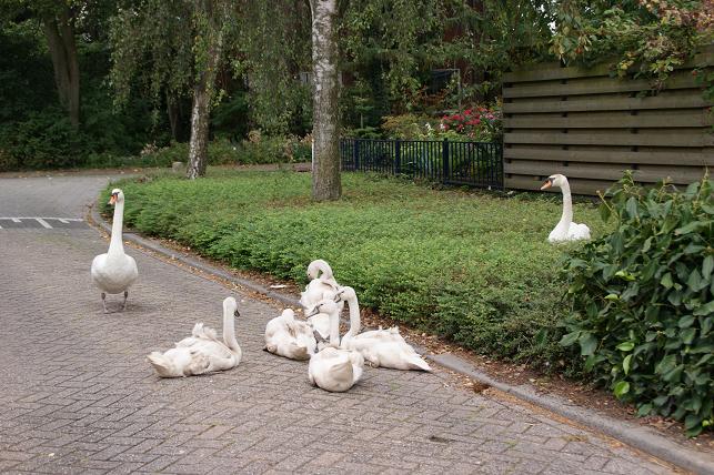 Zaterdag 8 augustus nam een zwanenfamilie de Berkenlaan in Linschoten in beslag. Het is nu eenmaal vakantie dus ook zij trokken er eens op uit. En waarom zou je dan niet gelijk midden op de weg gaan liggen..... Uiteindelijk keerde de zwanenfamilie weer terug naar hun vertrouwde stek in en langs de sloot.