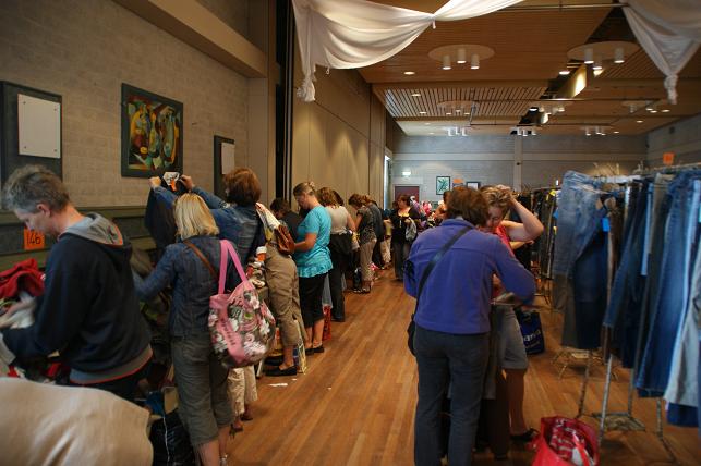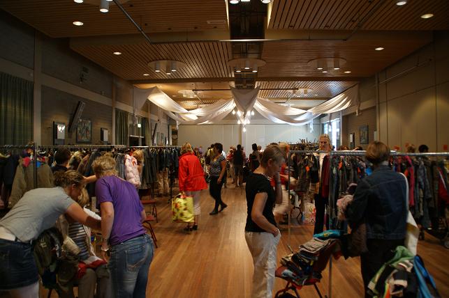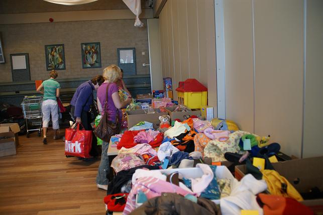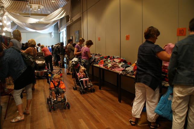 Er stonden in de zaal tafels en rekken vol met kinderkleding en speelgoed.