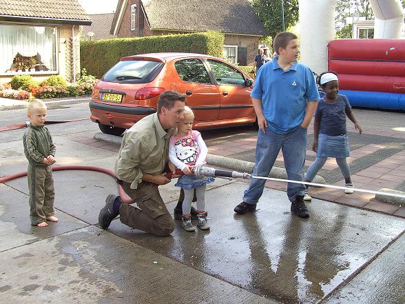 De kinderen konden zich uitleven op het springluchtkussen of de brandweerslang in de hand nemen en blokjes omver spuiten.