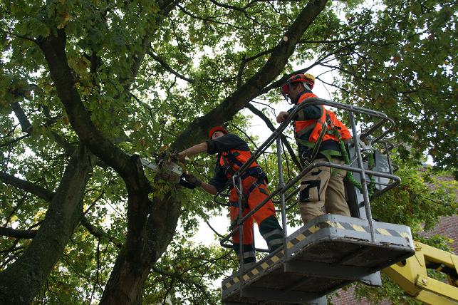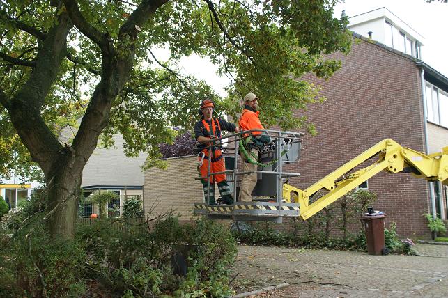 Hier werden de bomen bij de speeltuin aan de Strick van Linschotenstraat gesnoeid.