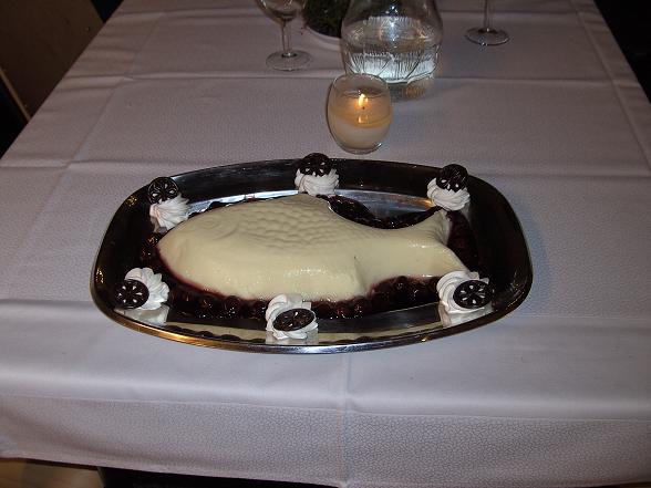 Het toetje (hierboven) in de vorm van een vis was oma's pudding met vruchtensaus.
