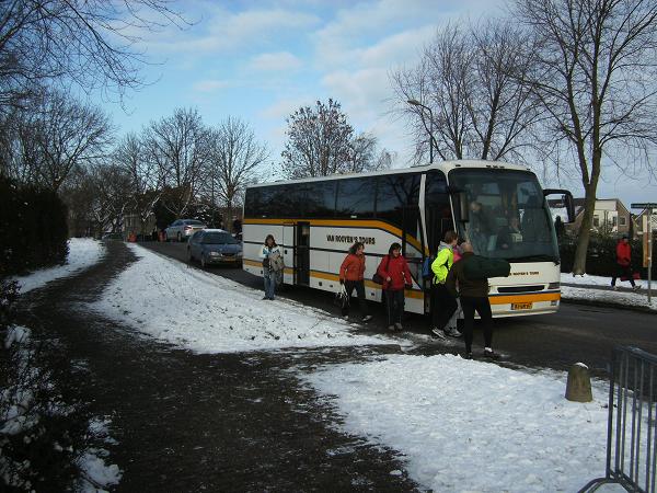 De eerste bussen met deelnemers komen aan in Linschoten.