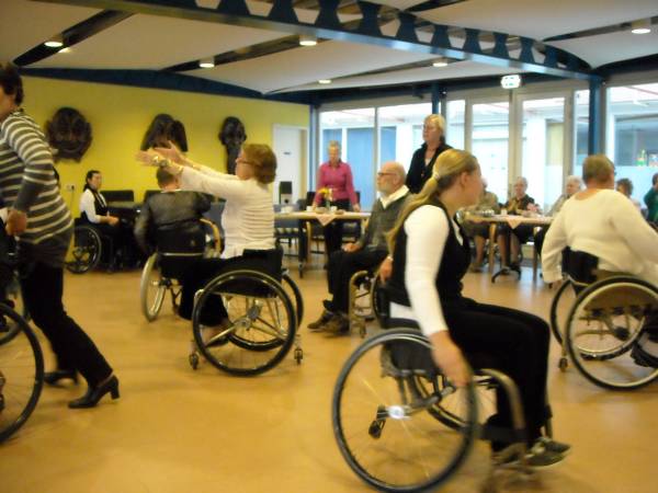 Bijzonder stijlvol zwierden de gewielde dansers en begeleiders rond. Ook de toeschouwers werden uitgenodigd voor een dansje, met rollator, rolstoel of op eigen benen.