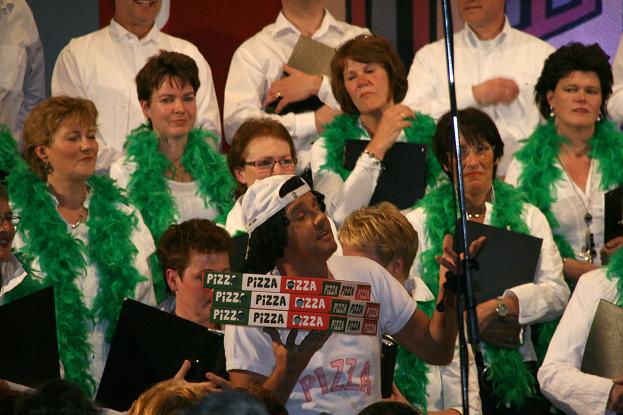 | Direct na het vrolijk gezongen Pasta kwam een plaatselijke pizzabakker (Cock Verkerk) met zijn bestelfiets de kerk binnen gereden om de bestelde pizza’s af te leveren terwijl het publiek vrolijk het pizzalied van André van Duin ‘Effe wachten’ meezong. Dat was een prima opmaat voor het publiek om ook mee te zingen met La donna e mobile uit Verdi’s opera Rigoletto, het laatste lied voor de pauze.