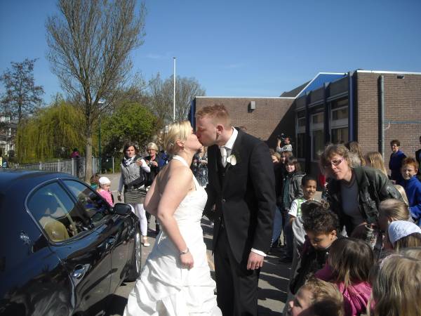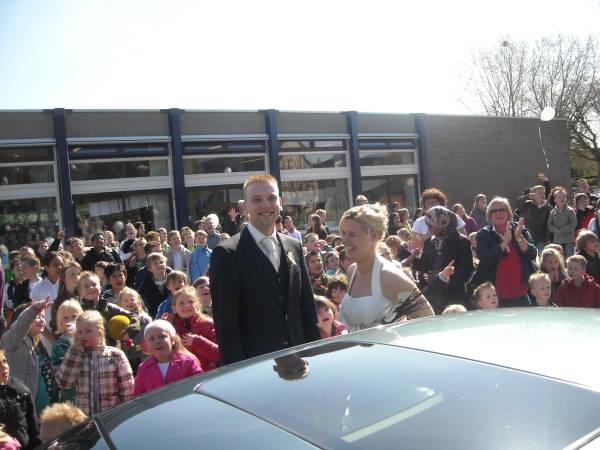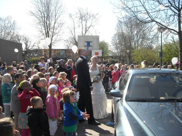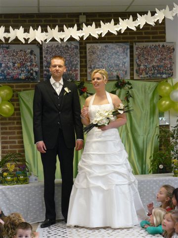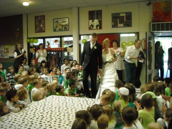 Vrijdag 23 april kwamen juf Nancy en Wiebejan aan bij de Hobbitstee in Montfoort waar alle leerlingen van de school een erehaag hadden gevormd voor het bruidspaar. Honderden witte ballonnen werden opgelaten (helaas vingen de bomen er een aantal op)