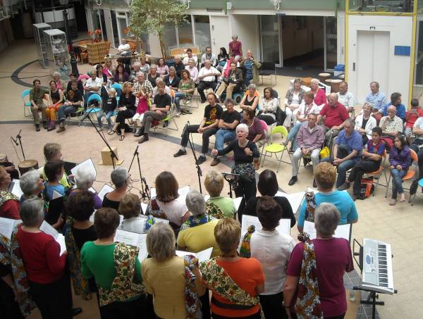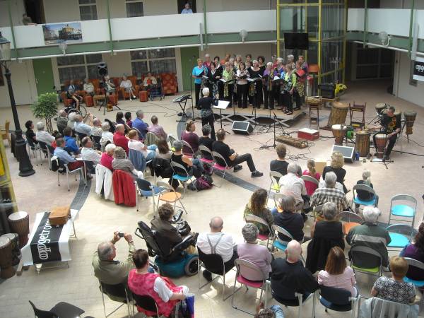 Zaterdag 29 mei verzorgden vrouwenkoor Noyana uit Montfoort en slagwerkgroep Opgetrommeld uit Woerden een donderend optreden in Antoniushof. De percussiegroep met traditionele tam-tams dwong het koor in een voor hen ongekend ritme. Maar de dames lieten zich, vierstemmig, niet van de wijs brengen.